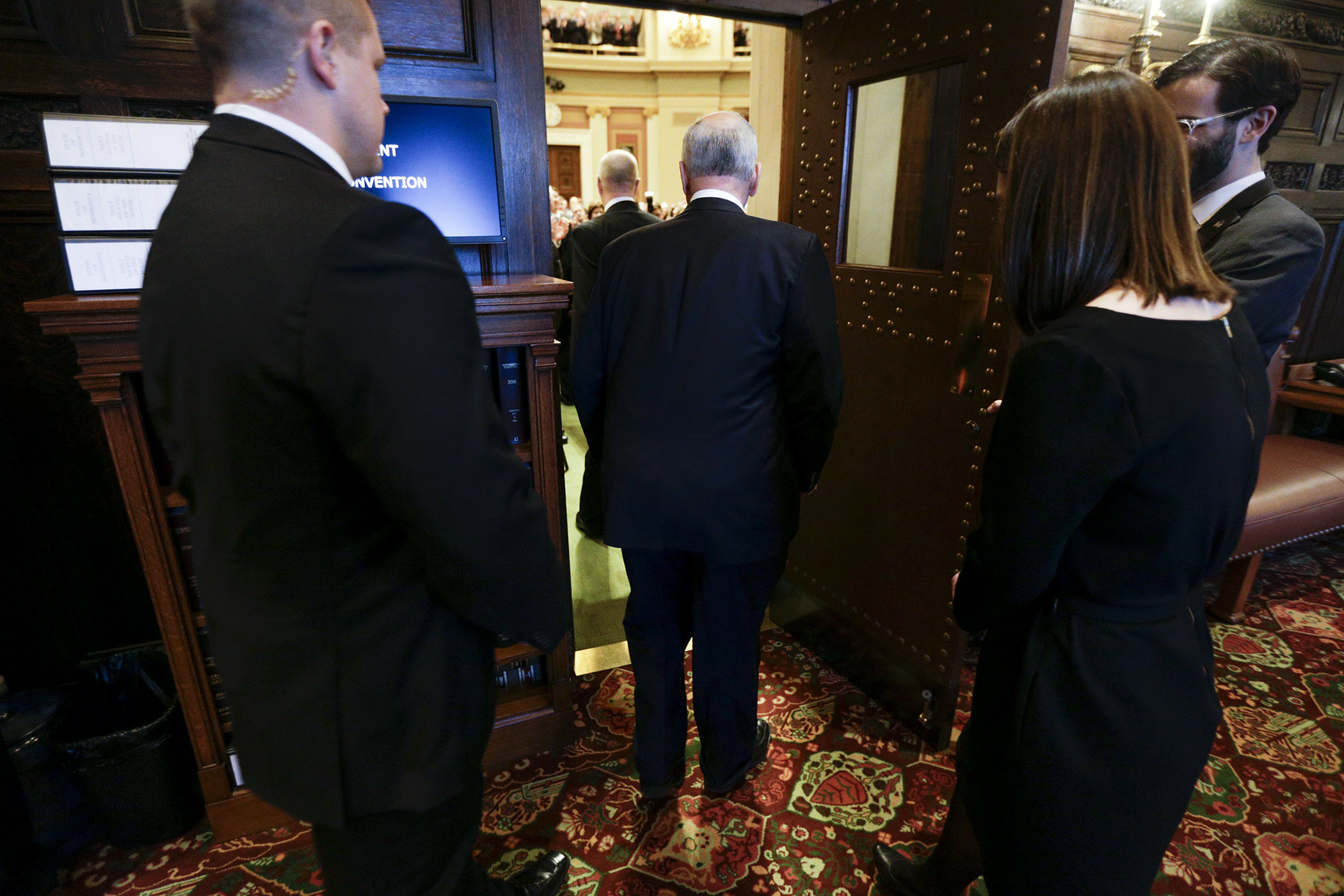 Gov. Mark Dayton heads out of the House Retiring Room to deliver his last State of the State Address. Photo by Paul Battaglia“I know they asked for less than what they need because they thought that was all the Legislature would support,” Dayton said. “Well… Surprise them!”