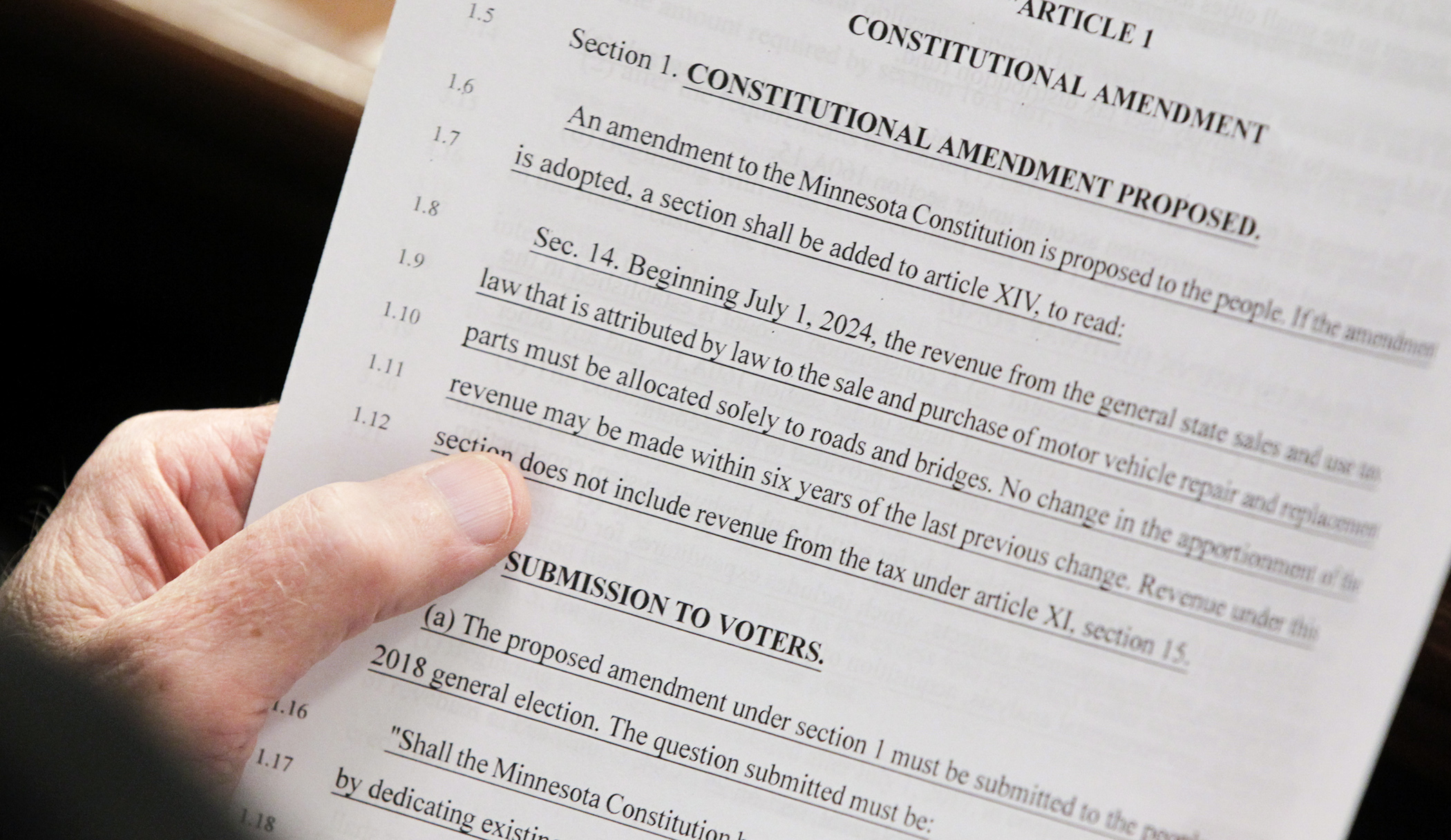 “Shall the Minnesota Constitution be amended to increase funding for roads and bridges by dedicating existing sales tax revenue from the sale of motor vehicle parts?"
