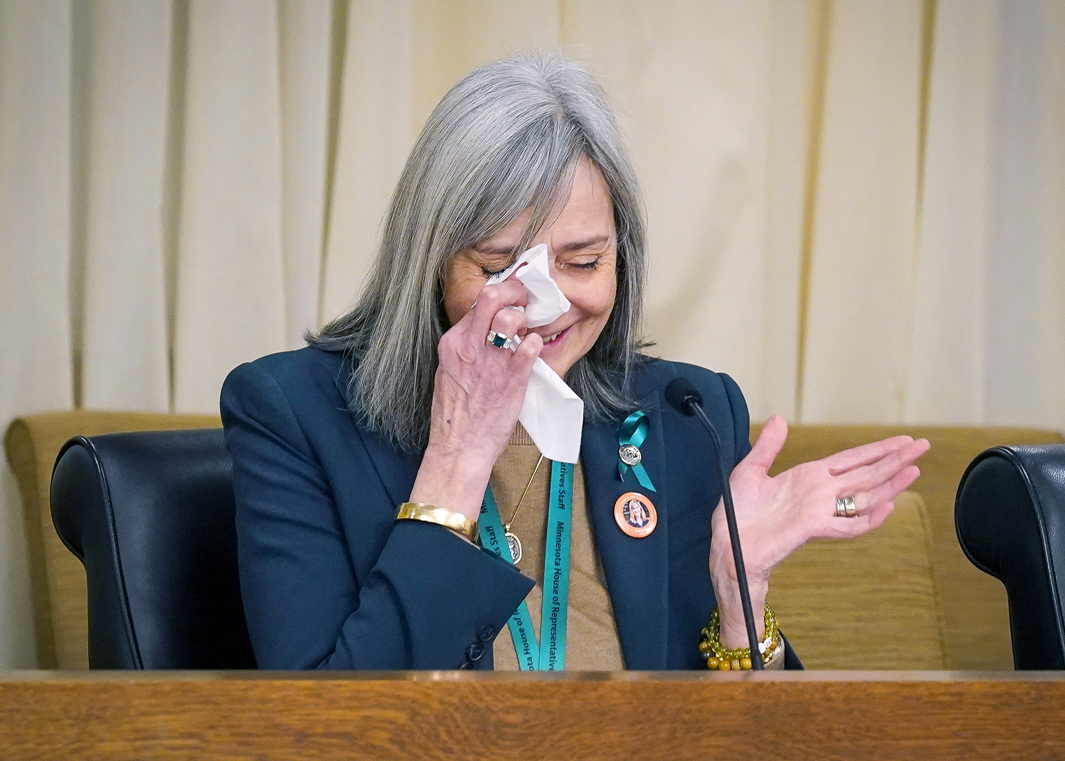 Rep. Ginny Klevorn wipes away tears during emotional presentation of a bill that would rename the State Office Building after late Speaker Emerita Melissa Hortman. (Photo by Andrew VonBank)Sponsored by Rep. Ginny Klevorn (DFL-Plymouth), HF3455, as amended, next heads to the House Ways and Means Committee.