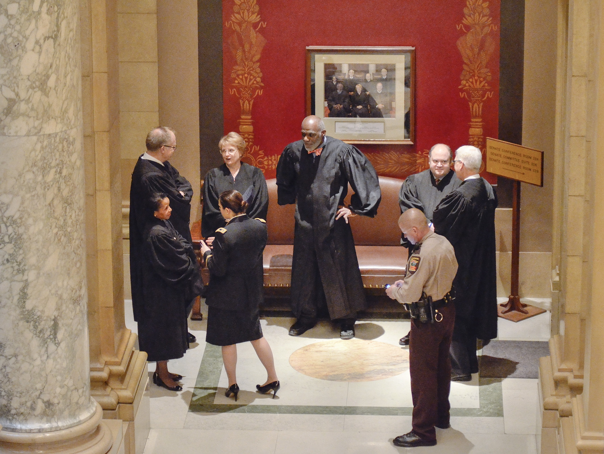 Members of the Minnesota Supreme Court await their entry into the House Chamber ahead of then-Gov. Mark Dayton's address in 2014. (House Photography file photo)If his State of the State address had a thesis statement, it would be: “The best that this body can do is to equalize as nearly as may be the burden of taxation and so adjust it that its weight will not fall too heavily upon those unable to bear it, and distribute the responsibilities in accordance with the privileges enjoyed under our government.”
